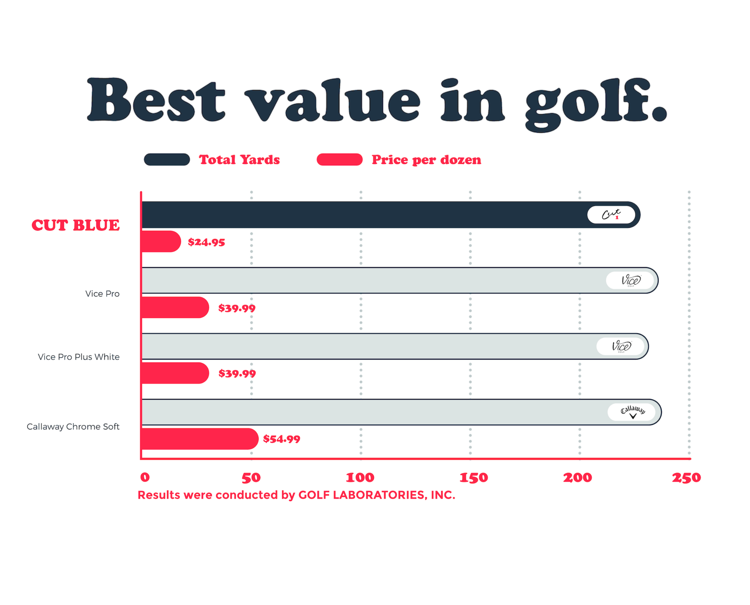 Golfers tell us this ball is the longest with a soft feel and a higher launch angle. With a compression of 90, Cut Blue really spins, and gives you excellent short game control.